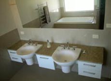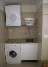 Both spacious bathrooms have a spa bath, double shower, double vanity and separate toilet. They each have a heated towel rail. Bathroom 1 has a built in laundry, with front loading washing machine, drier and laundry sink. |