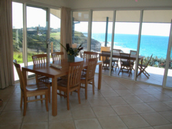 The dining and living areas open onto a large spacious tiled verandah, which returns around the north east corner of the villa. It is fully covered to maximise its use in all weather. Spectacular 270 degree beach, headland, ocean and mountain views are to be enjoyed from the timber outdoor furniture settings on the verandahs. |