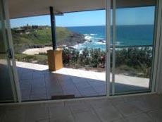 The kitchen, dining and living areas all face stunning uninterrupted views to the east through a continuous wall of glass which wraps around on both the northern and southern sides. All these rooms look out over Wakki Beach and the ocean. |